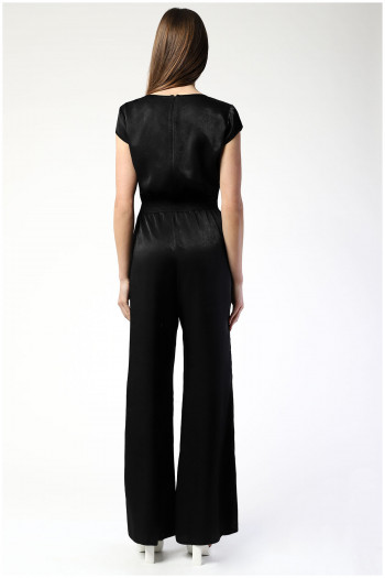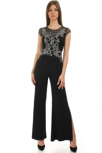 Black jumpsuit with floral motif lace. The loose fit combined with the viscose lining makes it suitable for all body types and provides comfort during wear.