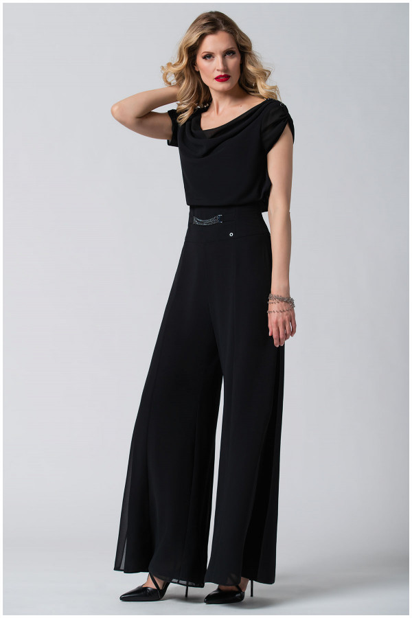 The elegant black overall is enriched with pleating around the neckline, enhancing its feminine appearance. Flowy legs and a slit on the upper layer along the side of the legs make it extremely comfortable. It styles perfectly with shoes from the Luna collection.