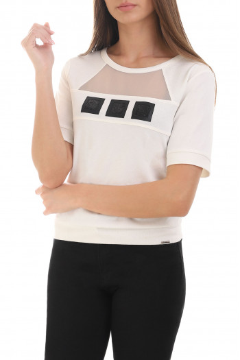 An elegant T-shirt with pleats on the chest and a specific application on the shoulders is...