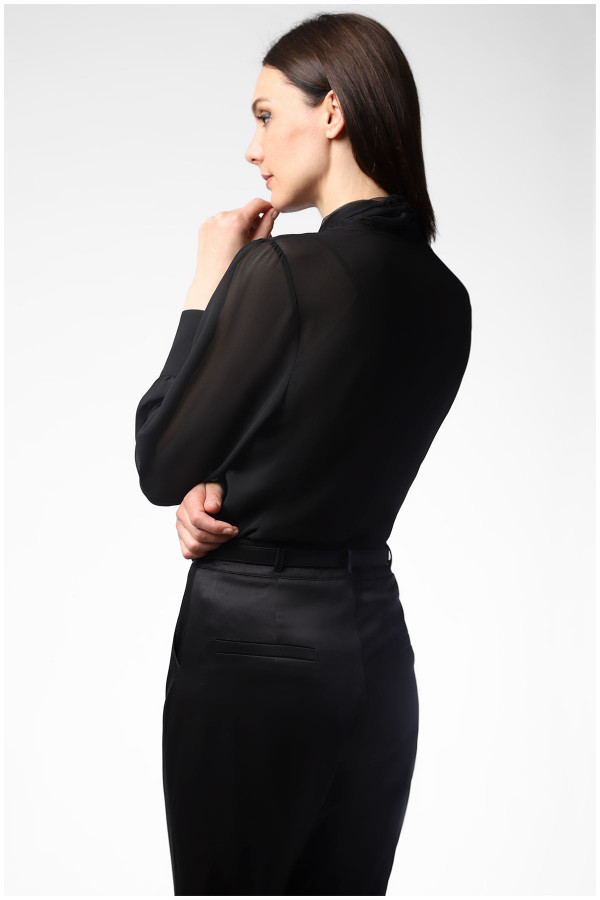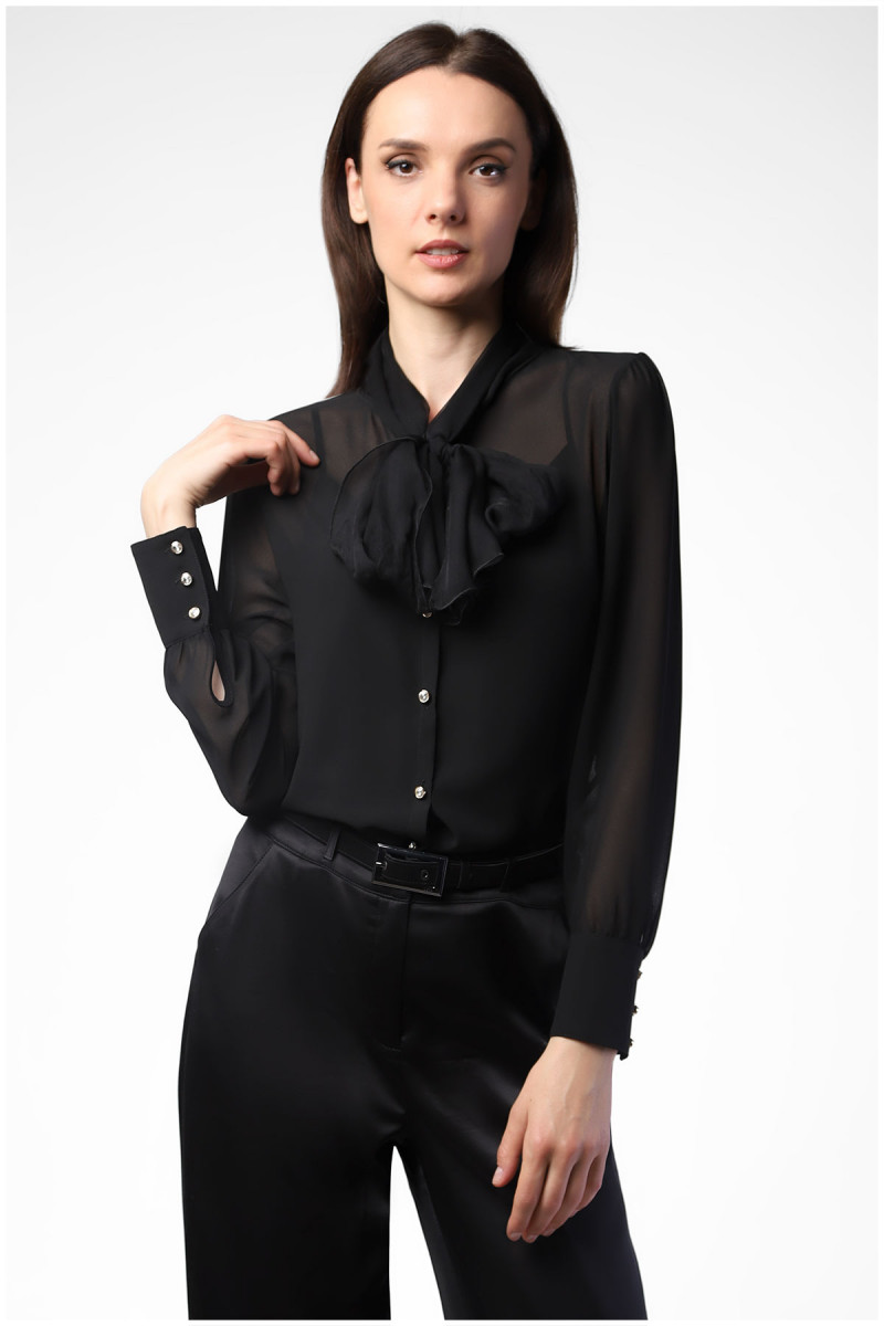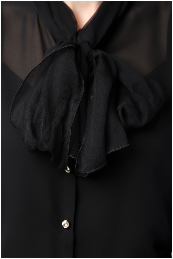 An elegant black shirt with a collar that ties around the neck. The authentic design is complemented by decorative buttons. Viscose undershirt adds to the comfort of this model. You can easily combine it with skirts and pants to achieve an effective look.