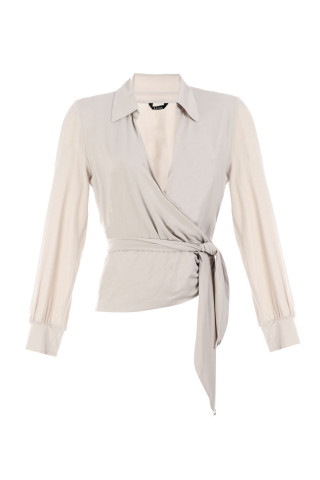 The wrap-style viscose beige shirt is asymmetrically designed. You can tie the belt in various ways and adjust it to your liking. It's easy to combine with different pieces.