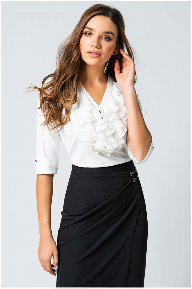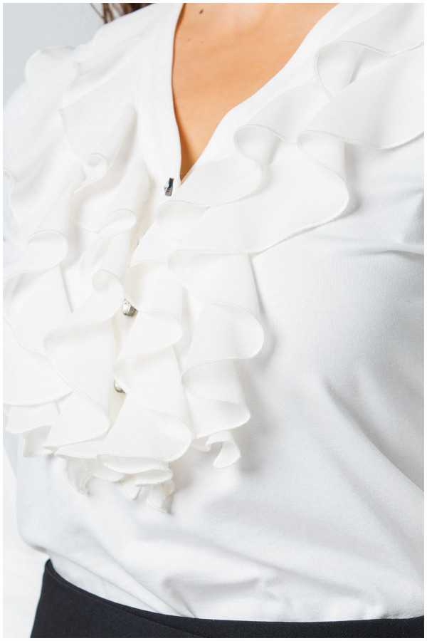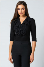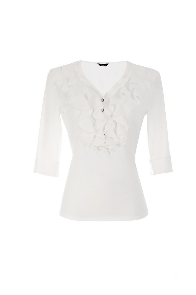 Viscose solid-color shirt with 3/4 sleeves. It is embellished with ruffles and decorative buttons around the neckline. It pairs perfectly with models from the Luna collection.