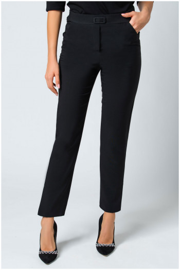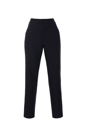 Navy blue slim-fit pants with a pleat on the inner side of the leg, designed to pair perfe...