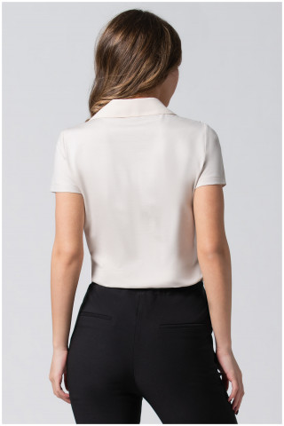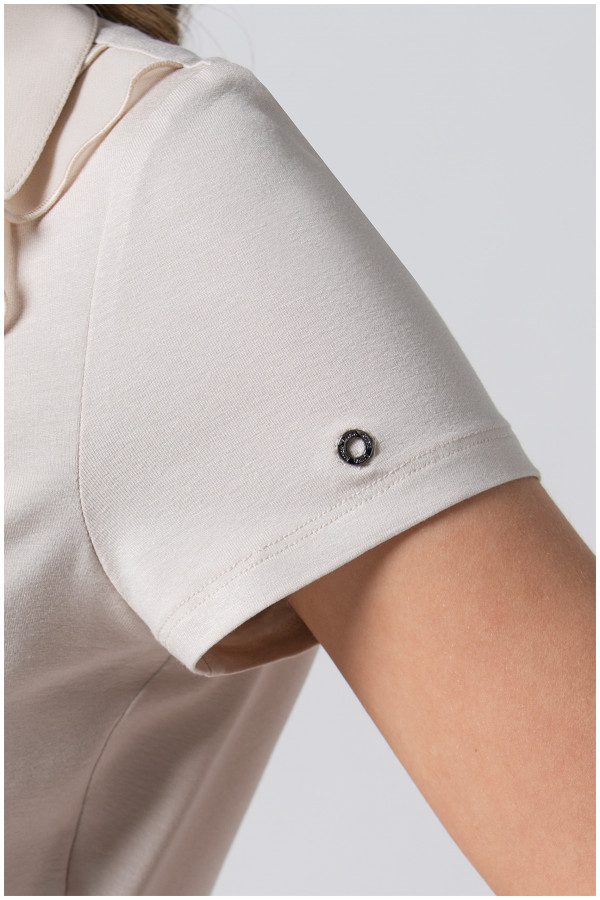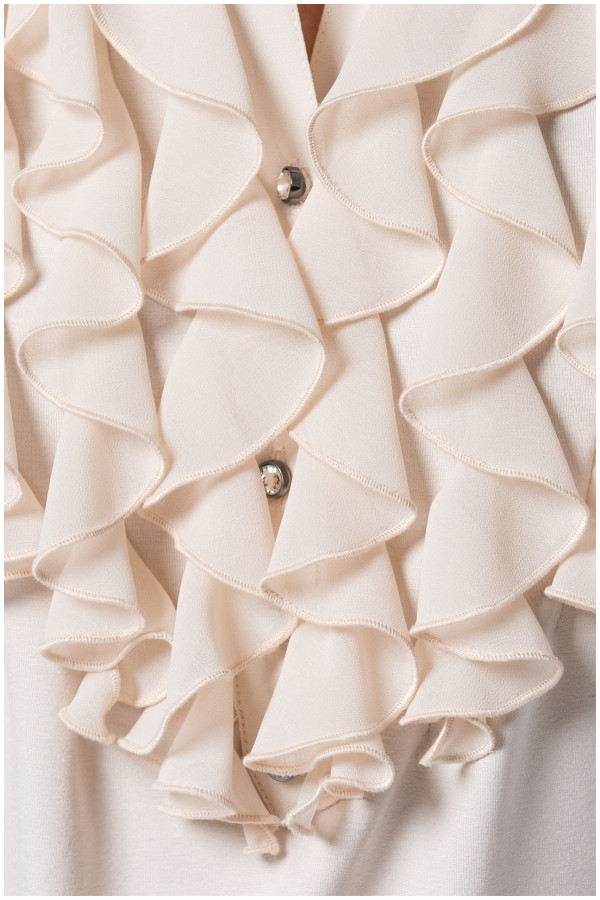 A viscose solid-colored shirt with 3/4 sleeves, adorned with flounces and decorative buttons around the neckline. It styles perfectly with items from the Luna collection.