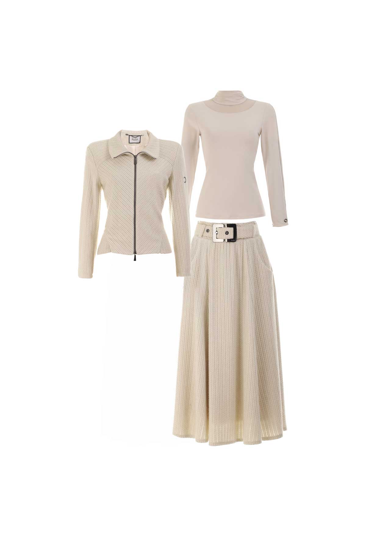 The long beige, wide-cut skirt fits perfectly for all body types and is very comfortable t...
