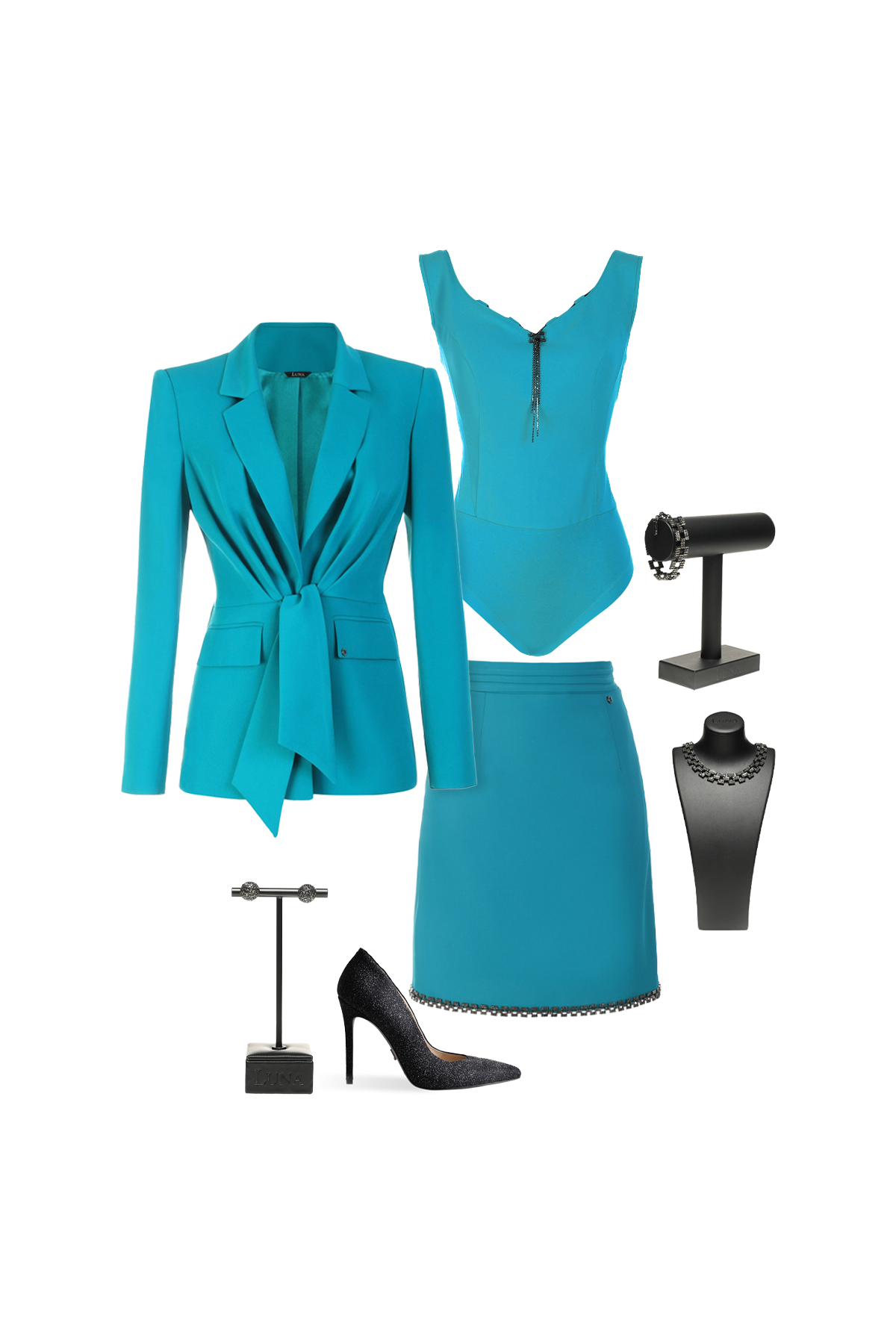 Tight straight-cut skirt in turquoise, perfectly complements the blazer from the same coll...