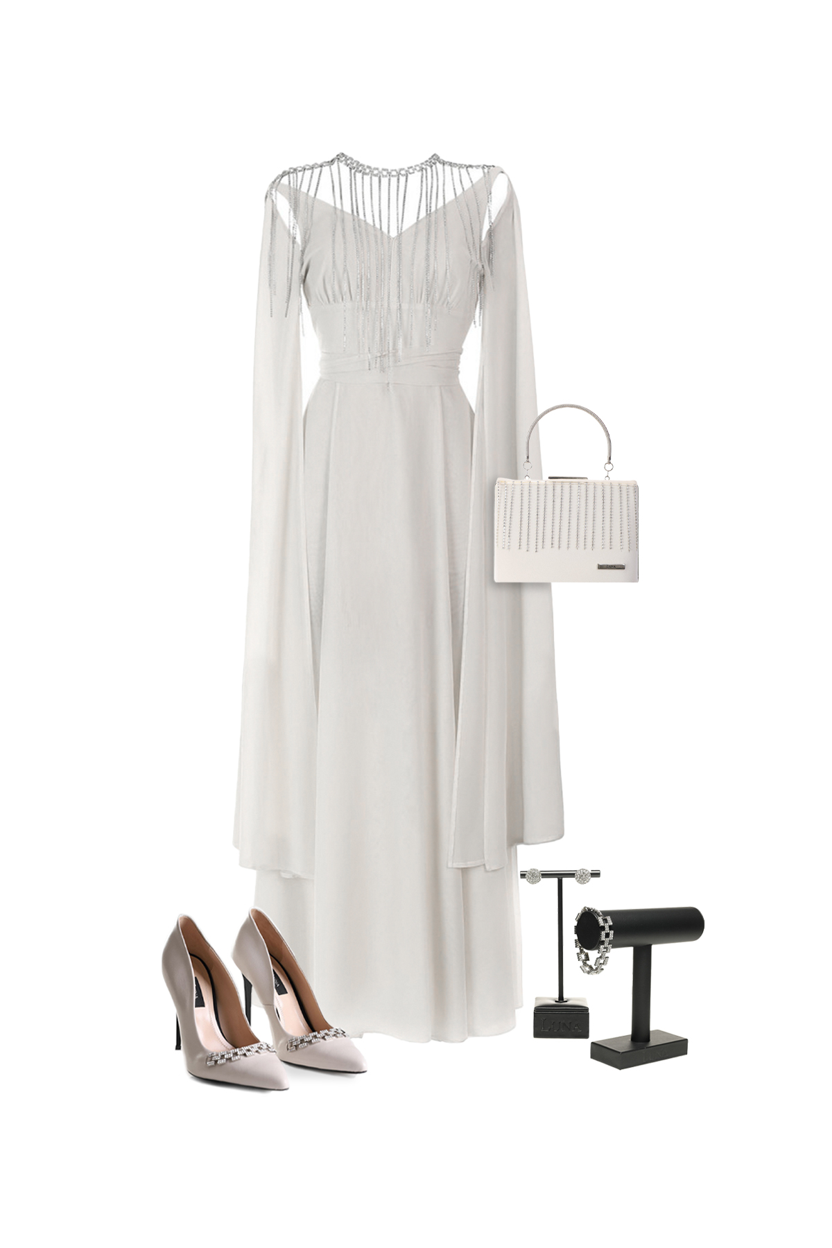 Sophisticated silver-toned earrings accentuate your elegance, subtly complementing the out...