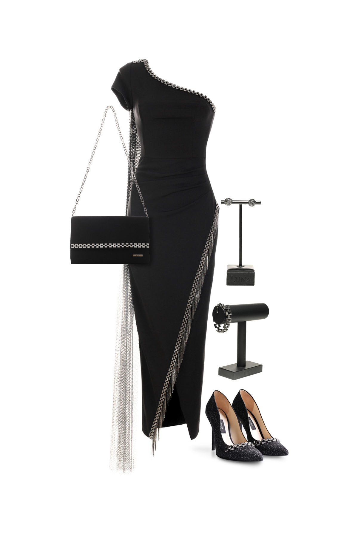 Formal black dress with an asymmetrical cut that pairs perfectly with shoes from the Luna ...