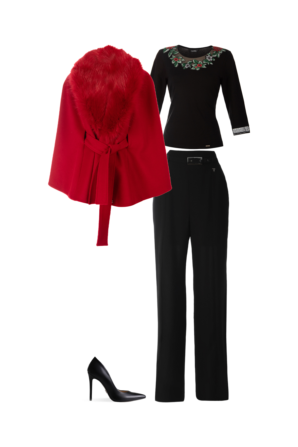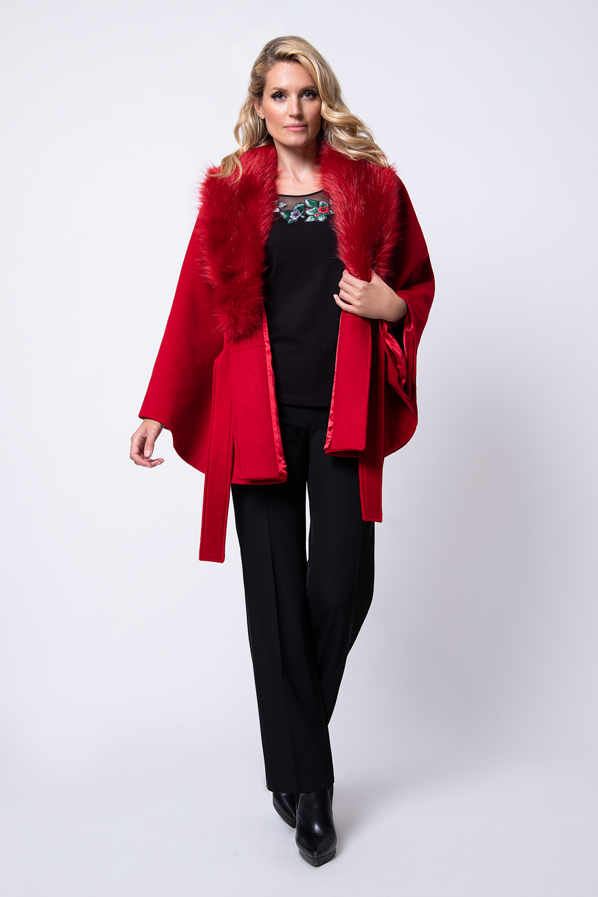 An elegant cape with luxurious faux fur is an excellent choice for cold days.