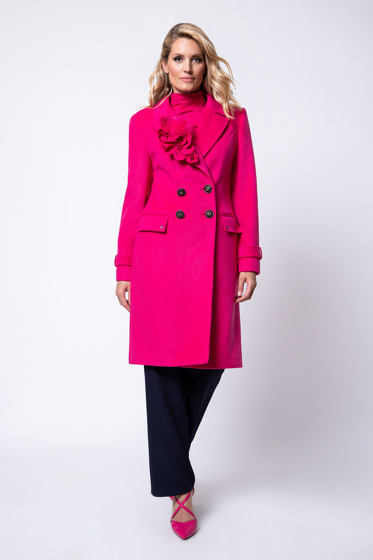 Feminine knee-length coat in fuchsia with a collar, pointed lapels, and flap pockets.