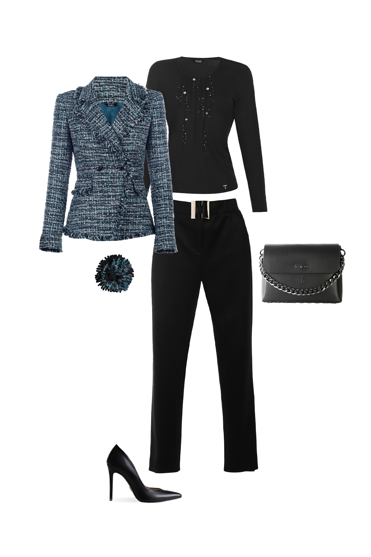 Elegant black slim-fit pants pair perfectly with a complementary blazer.