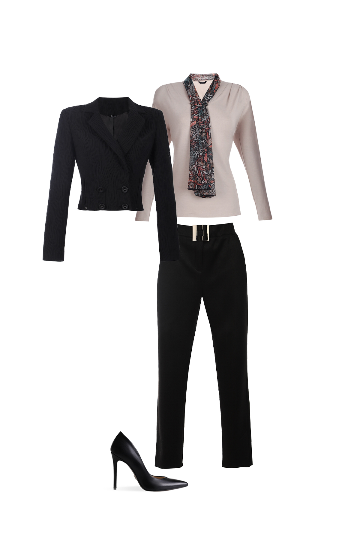 A fitted black blazer pairs excellently with other pieces from the same collection.