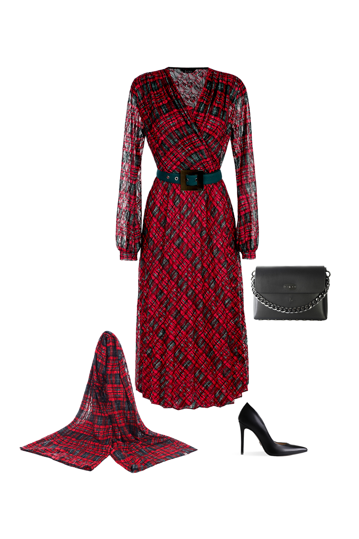 A pleated long dress with a checkered pattern that fits all body types beautifully.
