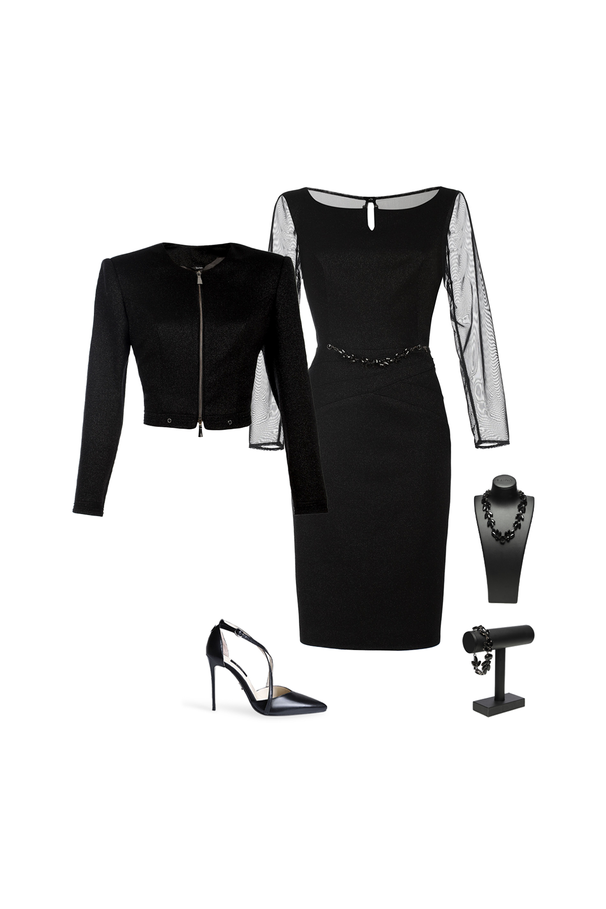 A classic black hip-length blazer pairs perfectly with pieces from the same collection.
