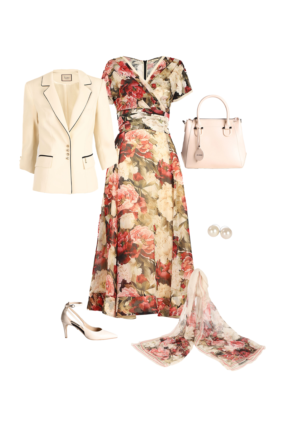 Floral scarf in harmonious burgundy and beige tones, serving as a striking yet understated...