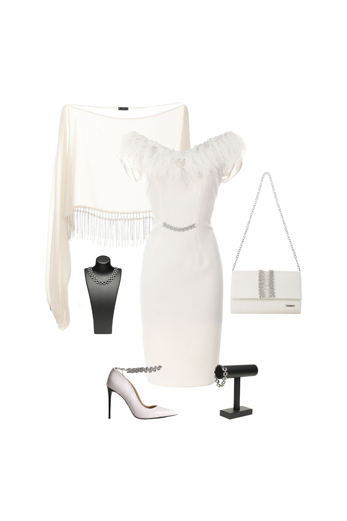 Elegant white dress with feathers that will leave a strong impression.