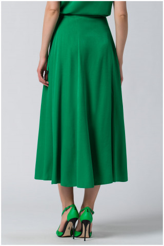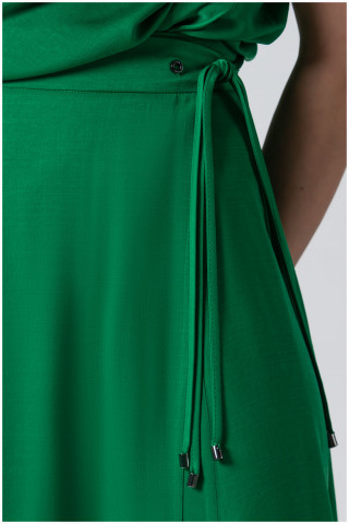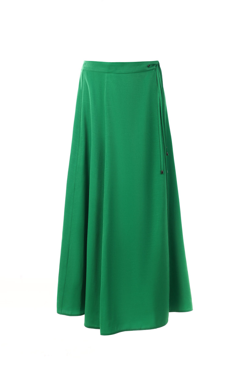 A green wrap midi skirt with a decorative tie on the side that further accentuates the waist. When combined with the blouse from the same collection, it achieves the effect of a dress.