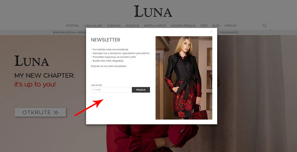 • nakon što posetite naš sajt pojaviće Vam se pop-up prozor sa obaveštenjem da se možete prijaviti na newsletter i tom prilikom je potrebno samo da unesete Vašu mail adresu u polju predviđenom za to.