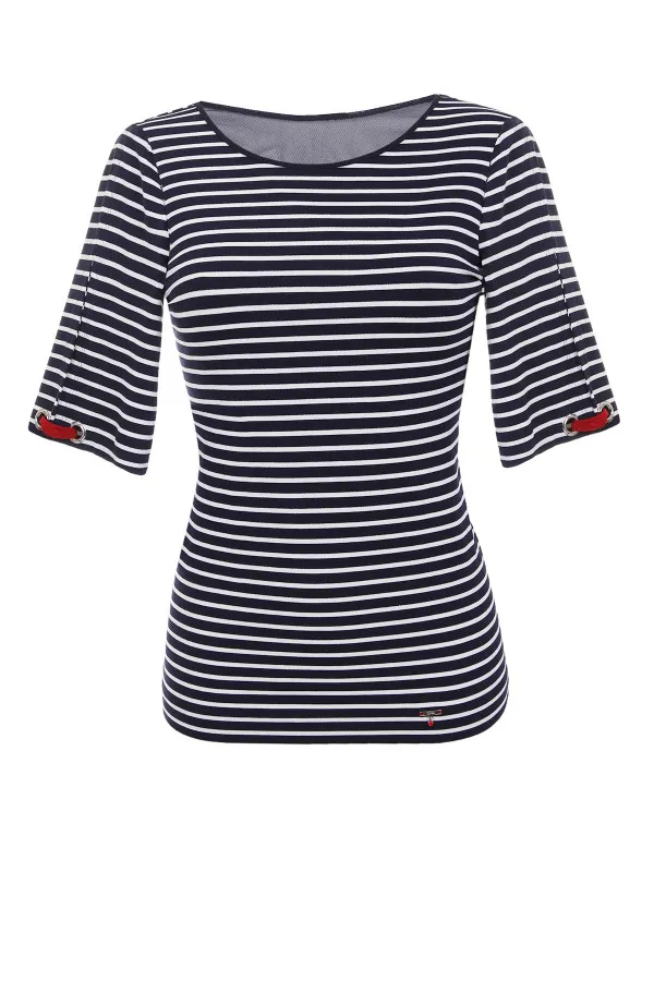 Elegantna teget bluza sa belim obrubom i suptilnim sjajem pruža lagan, prijatan osećaj ...
