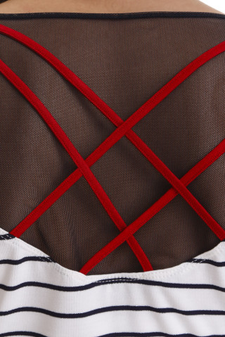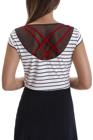 Atraktivna majica na pruge uskog kroja sa kratkim rukavima. Sa visokim procentom viskoze i elastina, ovaj model čini veoma udobnim za nošenje. U predelu leđa oplemenjena je blago transparentnim materijalom i ukrasnom, ukrštenom crvenom trakom. Veoma lako se kombinuje sa jednobojnim suknjama ili pantalonama.