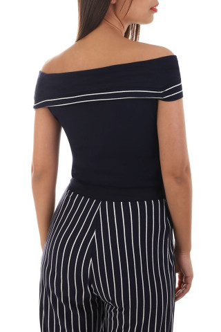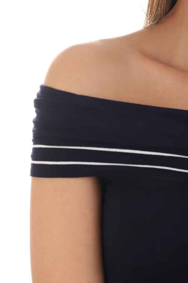 Elegantna teget bluza sa belim obrubom i suptilnim sjajem pruža lagan, prijatan osećaj ...