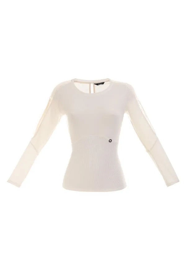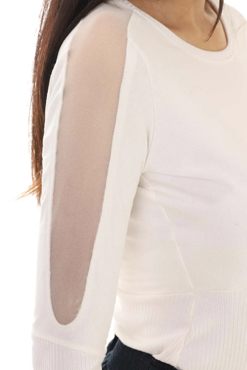 Bela bluza dugih rukava sa transparentnim detaljima.