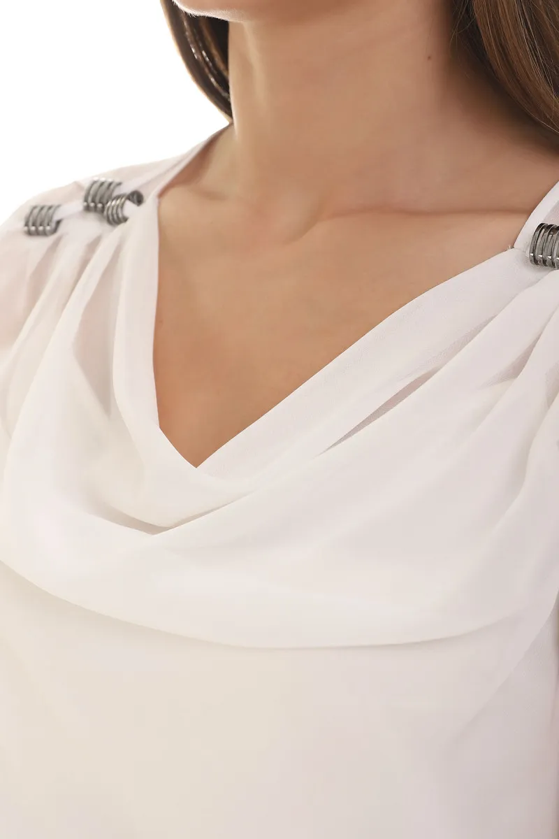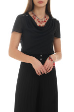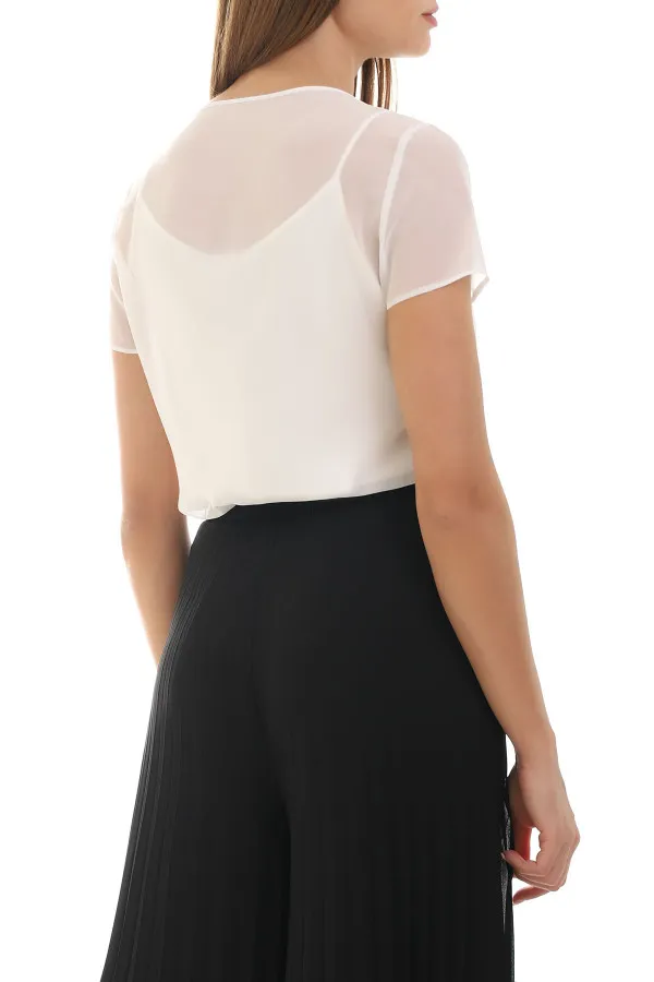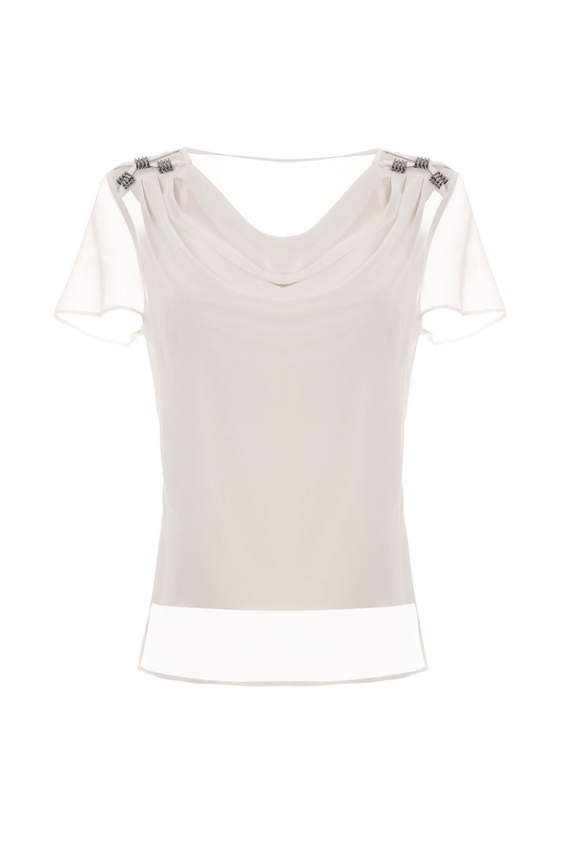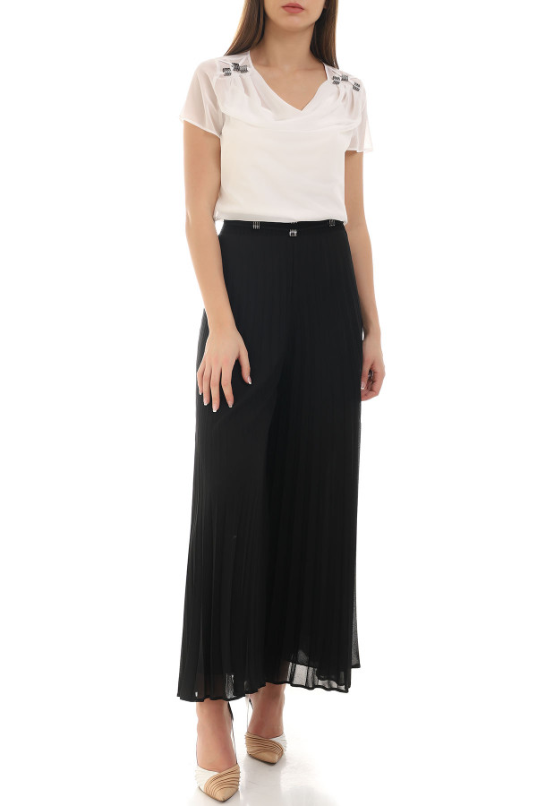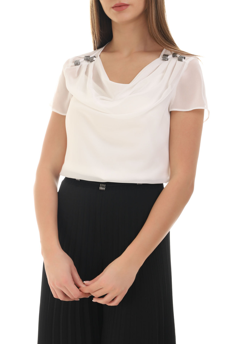 Efektan LUNA set koji se sastoji od dva odvojena dela - viskozne majice i prozračne bluze sa aplikacijom na ramenima. Sa ovim jedinstvenim komadom lako možete da kreirate autentične outfite koji magnetski privlače pažnju. Predlažemo Vam da set uparite sa plisiranim pantalonama iz nove kolekcije.