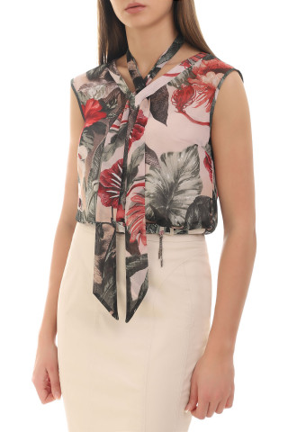 Lepršava tunika bez rukava u floralnom dezenu. Izrađena od laganog materijala koji prelepo pada. . Traku možete stilizovati na različite načine – nositi je puštenu ili je vezati u mašnu zbog čega je idealna za kombinovanje i postizanje različitog efekta u kreiranju outfita.