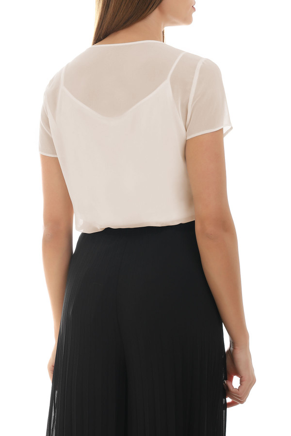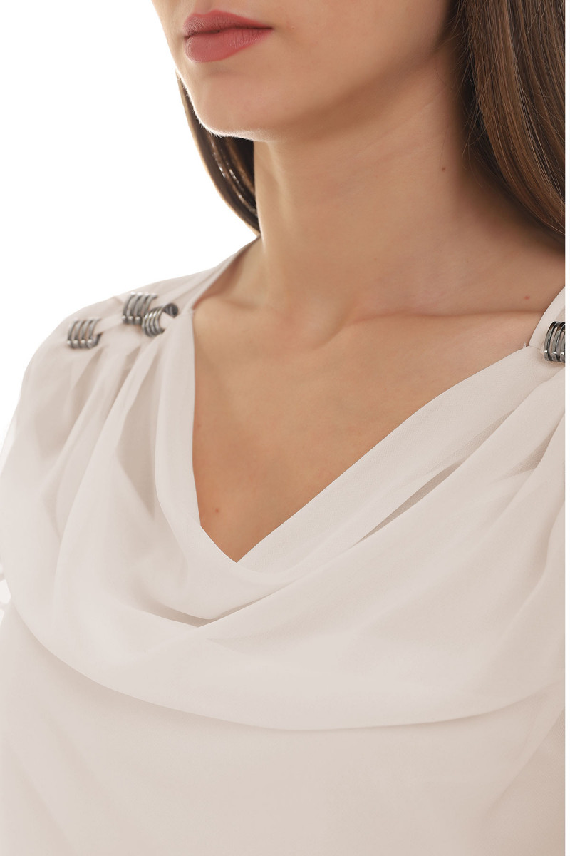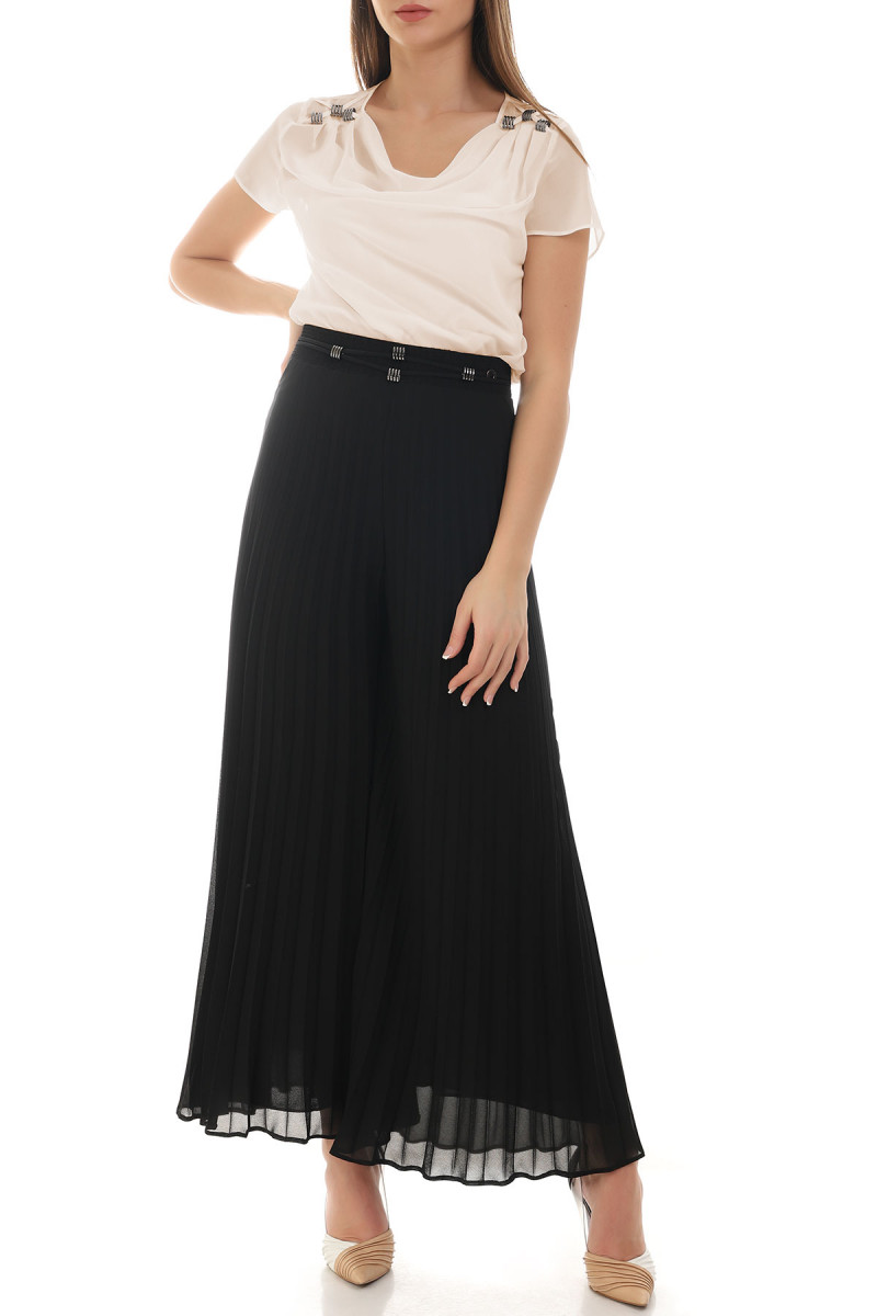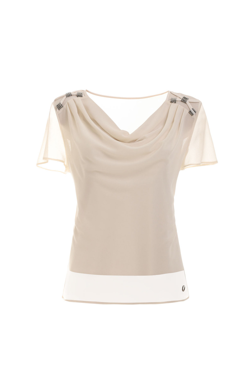 Efektan LUNA set koji se sastoji od dva odvojena dela - viskozne majice i prozračne bluze sa aplikacijom na ramenima. Sa ovim jedinstvenim komadom lako možete da kreirate autentične outfite koji magnetski privlače pažnju. Predlažemo Vam da set uparite sa plisiranim pantalonama iz nove kolekcije.