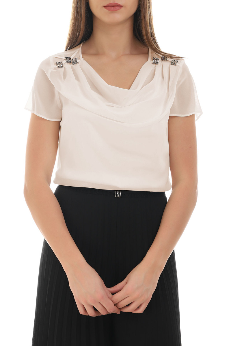 Elegantna bluza u bež boji preklopnog kroja sa suptilnim naborima i mekom, elastičnom t...