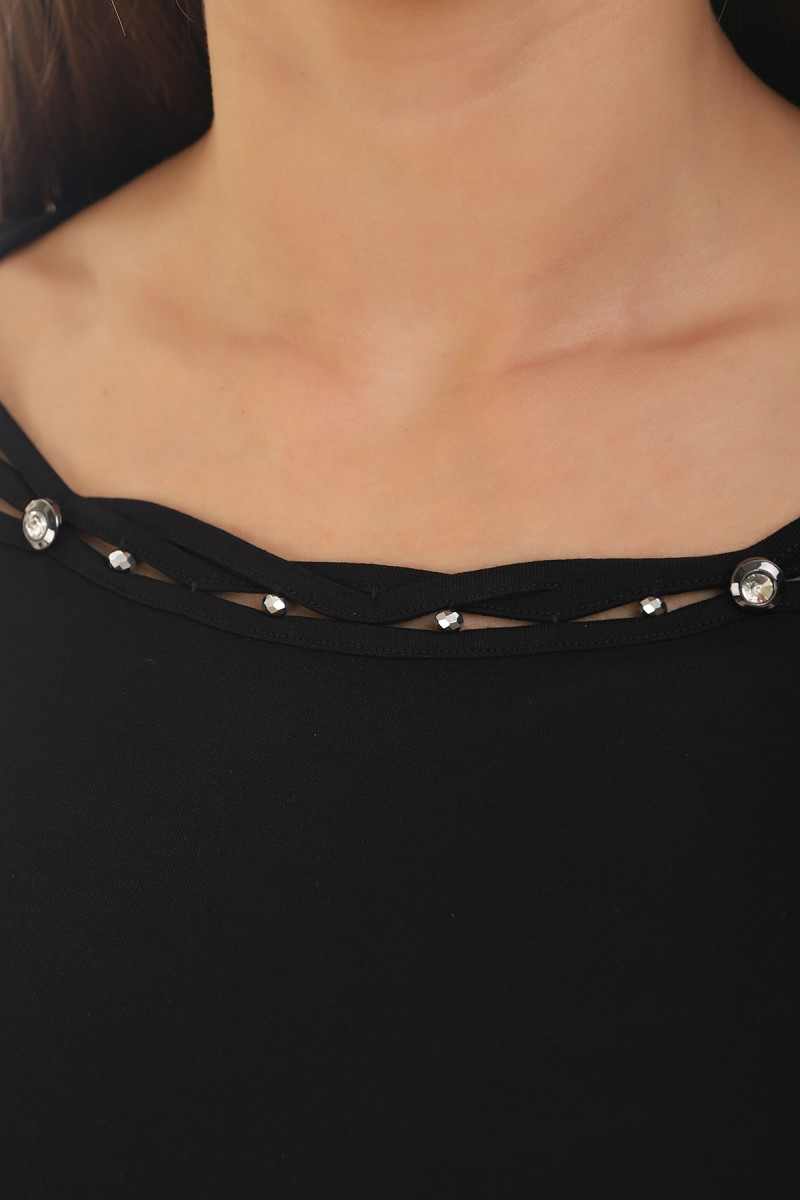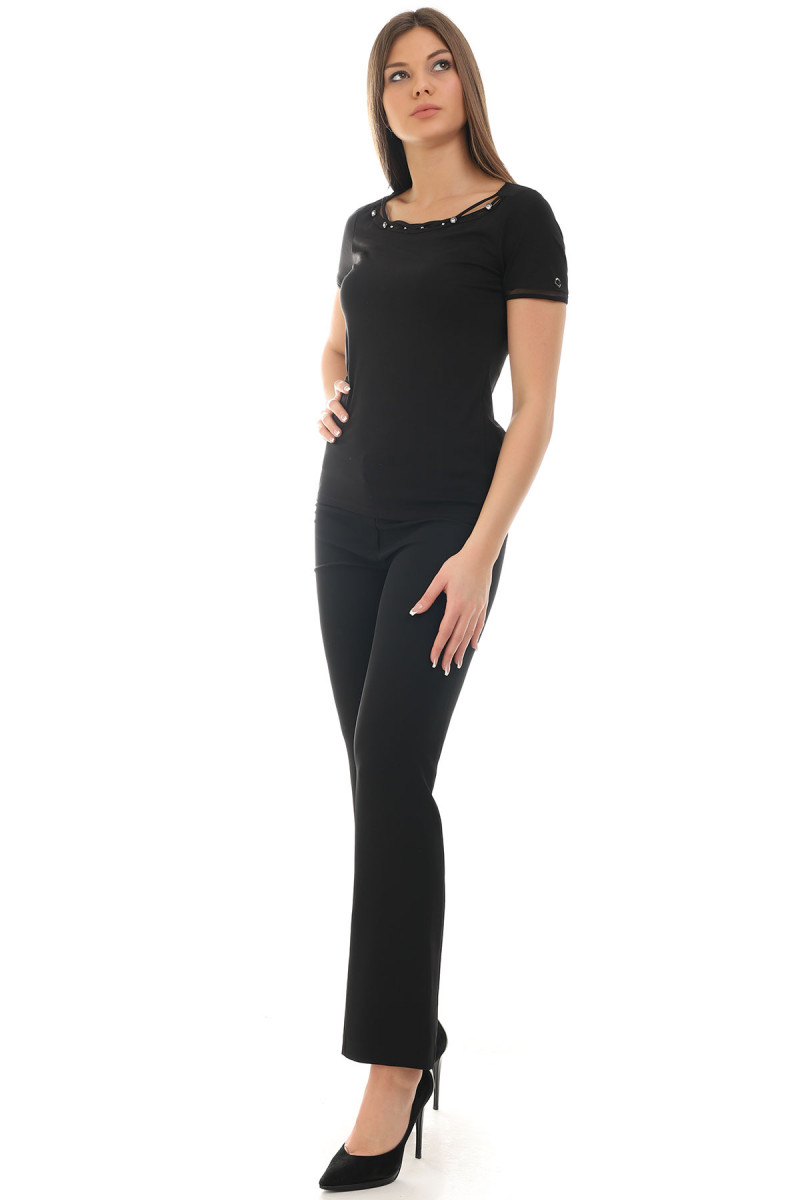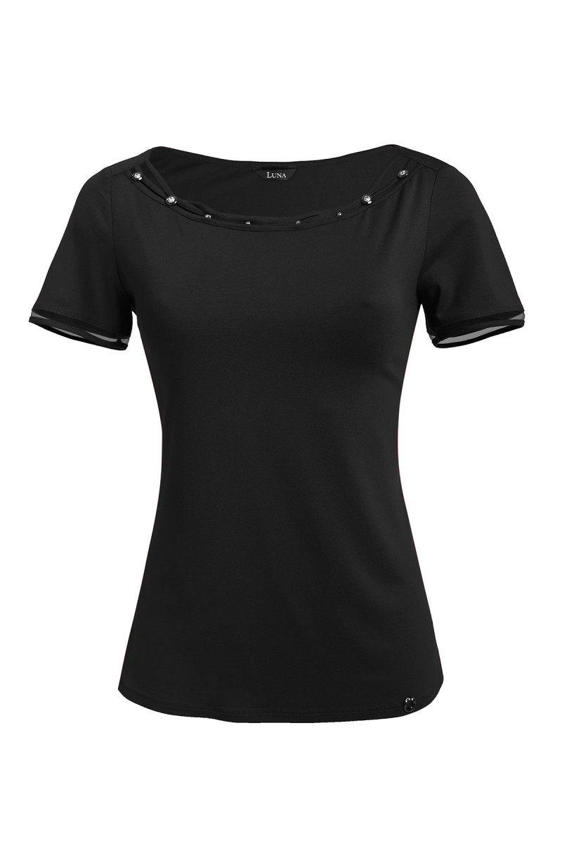 Elegantna crna bluza sa belim obrubom i suptilnim sjajem pruža lagan, prijatan osećaj i...