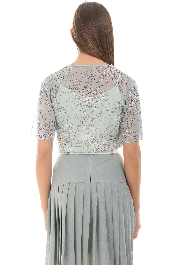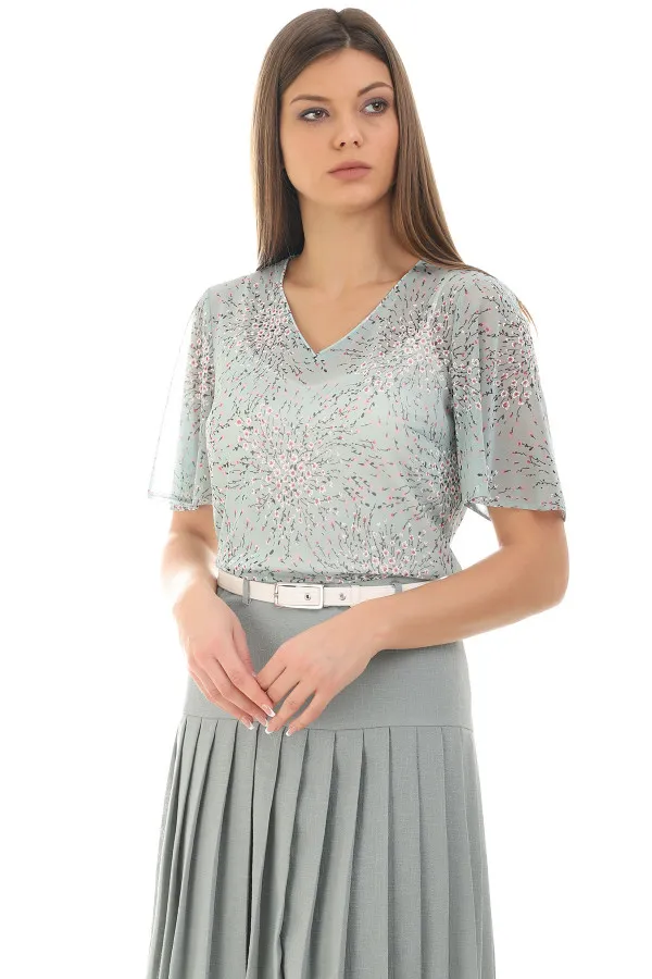 Elegantna tunika u mint boji sa cvetnim detaljima. Uz telo prijanja mekana podmajica od viskoze, dok prozračni til unosi notu sofisticiranosti. Odlično se kombinuje sa pantalonama i suknjama iz nove kolekcije.