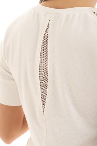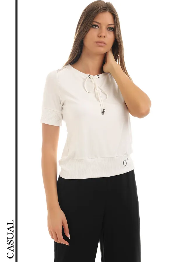 Elegantna teget bluza sa belim obrubom i suptilnim sjajem pruža lagan, prijatan osećaj ...