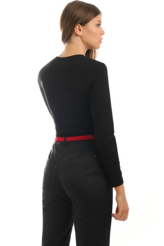 Elegantna crna bluza sa belim obrubom i suptilnim sjajem pruža lagan, prijatan osećaj i...
