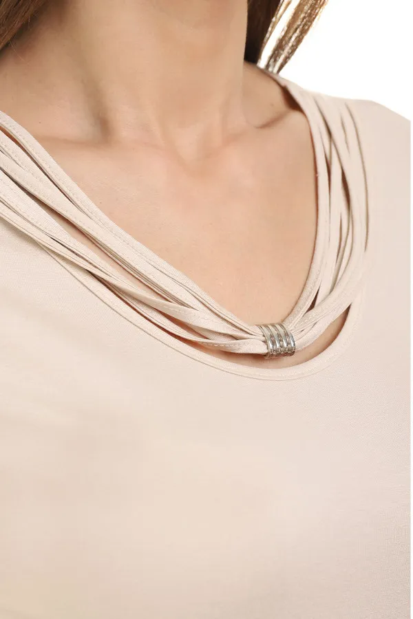 Elegantna bluza u bež boji preklopnog kroja sa suptilnim naborima i mekom, elastičnom t...