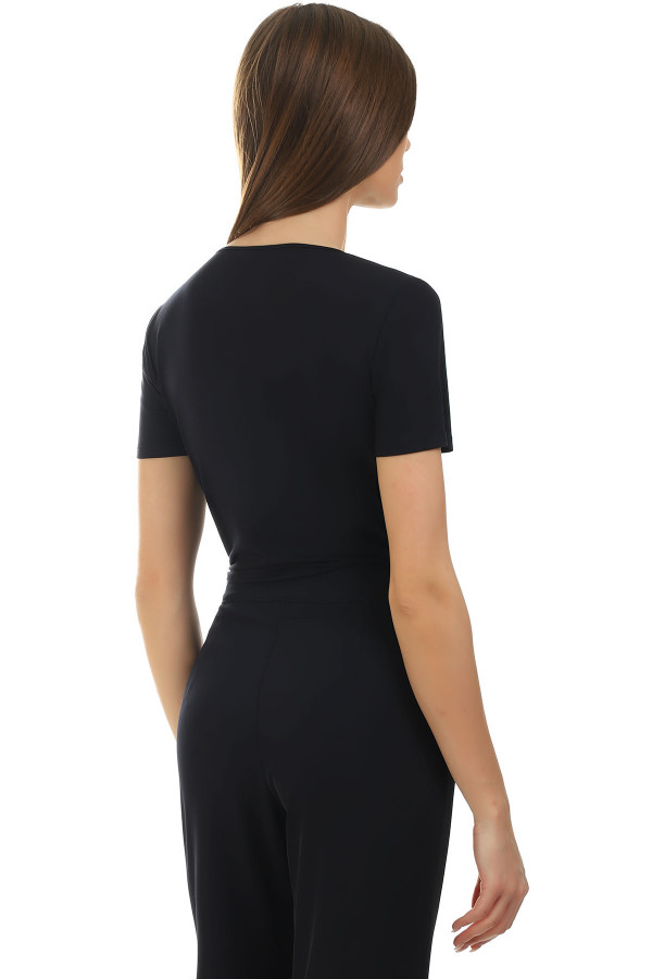 Elegantna bluza u antracit-crnoj boji preklopnog kroja sa suptilnim naborima i mekom, e...