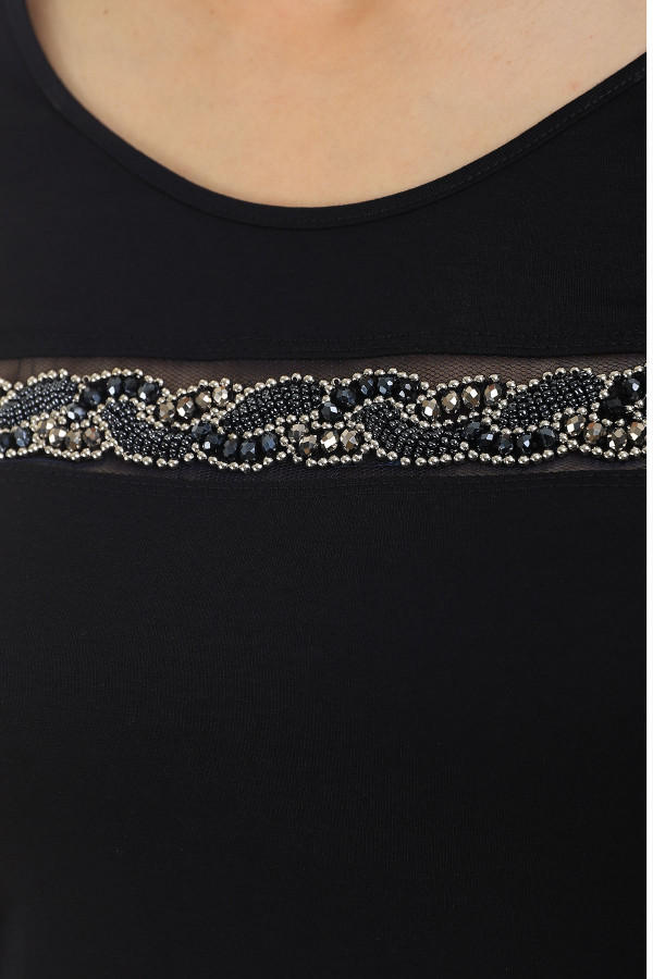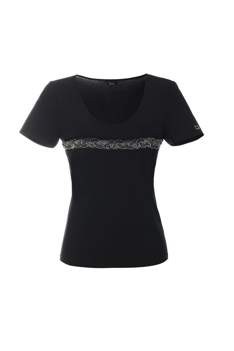 Elegantna crna bluza sa belim obrubom i suptilnim sjajem pruža lagan, prijatan osećaj i...
