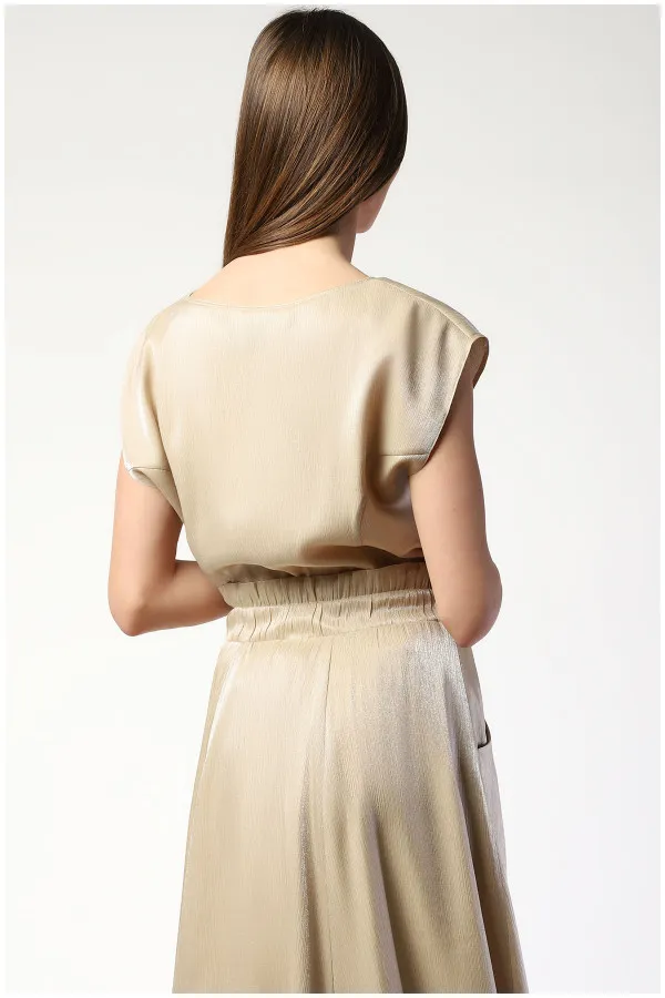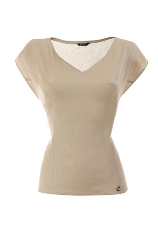Elegantni bež top. Visok procenat viskoze čini ga vrlo prijatnim za nošenje. "V" izrez dodaje notu ženstvenosti. U kombinacijii sa suknjom iz iste linije kreiraćete savršen monohromatski outfit.