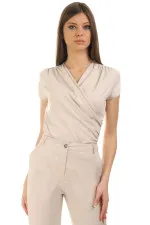 Elegantna bluza u bež boji preklopnog kroja sa suptilnim naborima i mekom, elastičnom t...