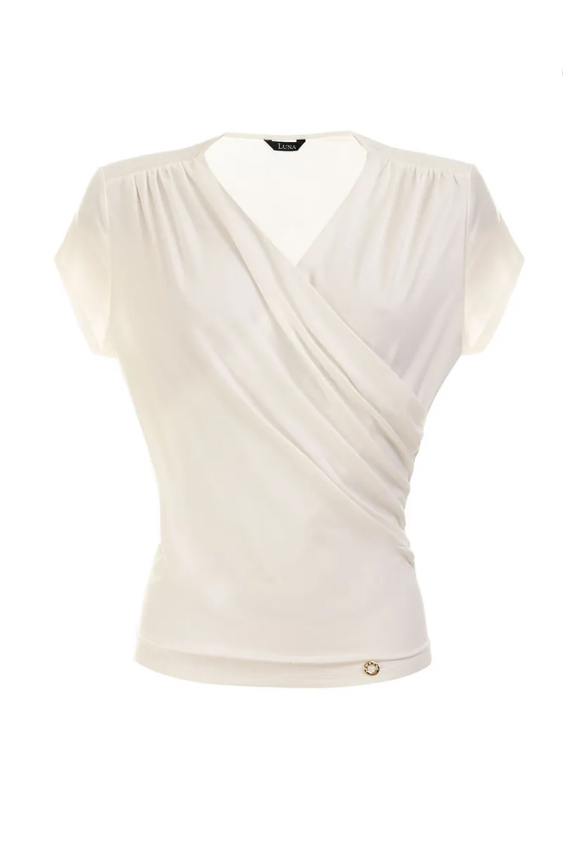 Majica kratkih rukava sa dekolteom na preklop nezaobilazni je komad tokom letnjih dana. Viskoza u kombinaciji sa elastinom čini je vrlo prijatnom za nošenje, a kroj joj omogućava da se jednostavno uklapa u mnogobrojne outfite. Možete je kombinovati sa pantalonama ili suknom za svečane prilike, a ako dodate i sako spremni ste za poslovni sastanak.