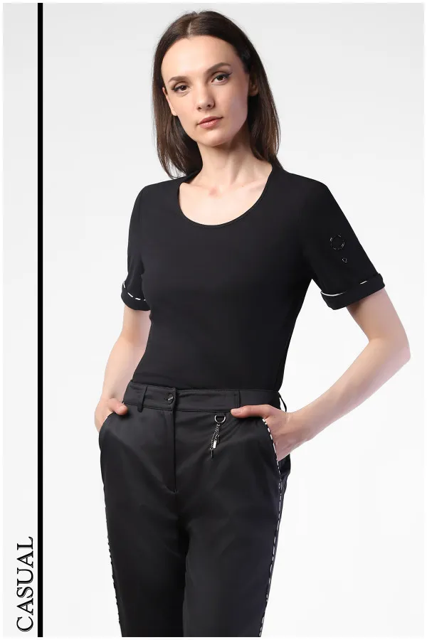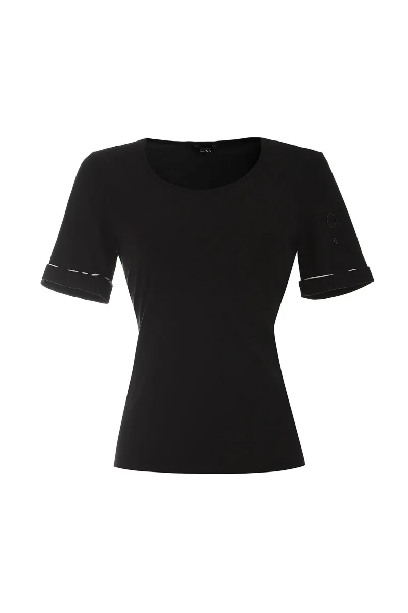 Klasična viskozna majica u crnoj boji sa oblim izrezom. Lagani materijal sa visokim procentom elastina čini je vrlo komfornom. Jednostavno se može kombinovati sa mnogim trenerkama, suknjama i farmericama.