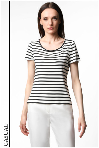 Viskozna majica na pruge. Visok procenat elastina u kombinaciji sa prirodnim materijalom čini je vrlo udobnom za nošenje. Jednostavno je možete uklopiti sa pantalonama ili suknjama iz iste linije.