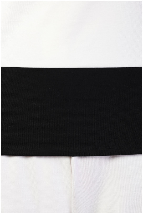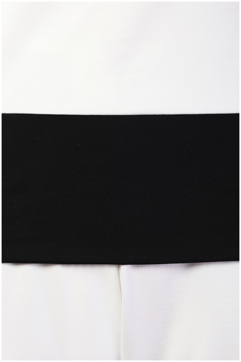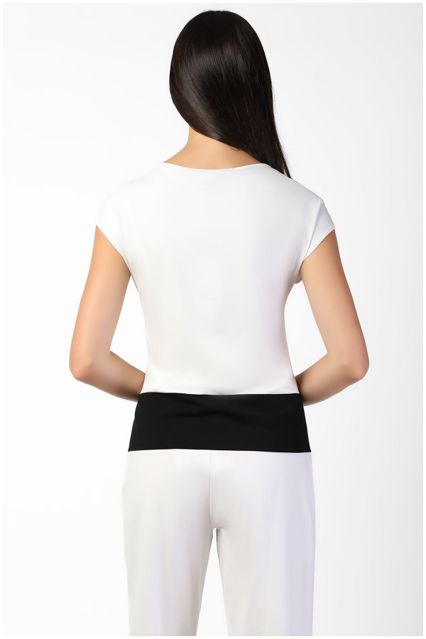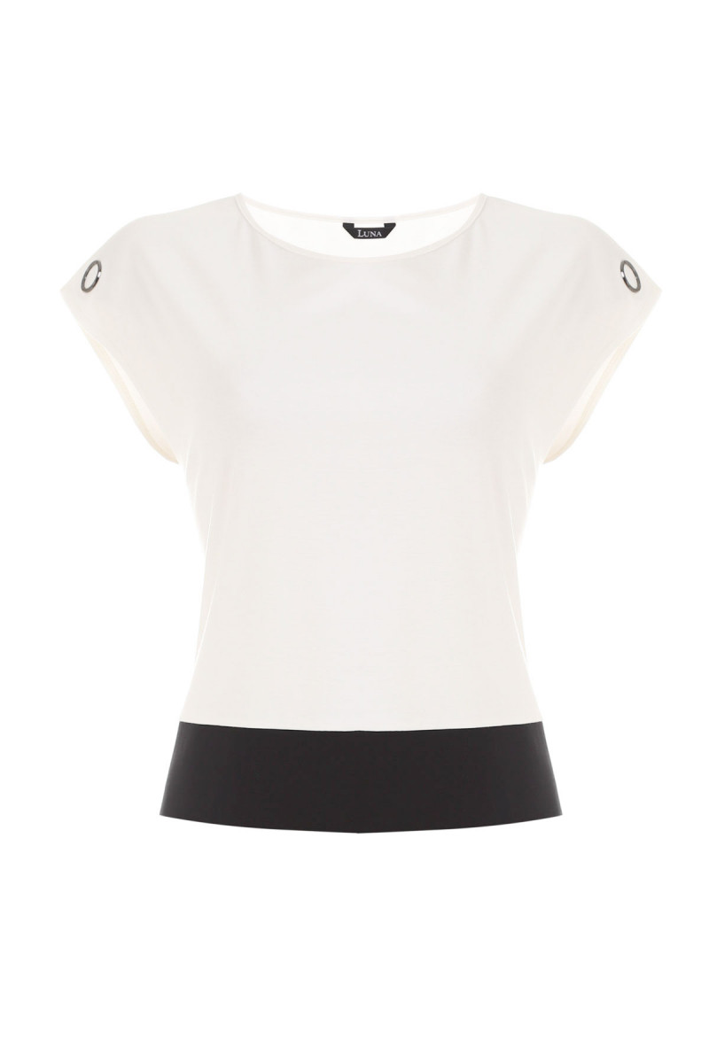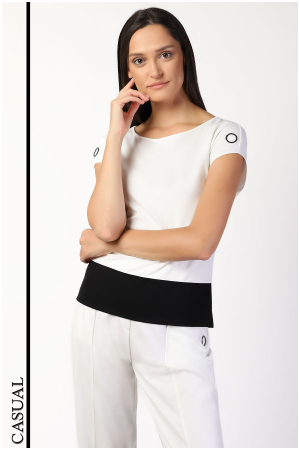 Bela viskozna majica sa crnom bordurom na donjem delu savršeno se kombinuje sa Luna pantalonama, trenerkama i suknjama.