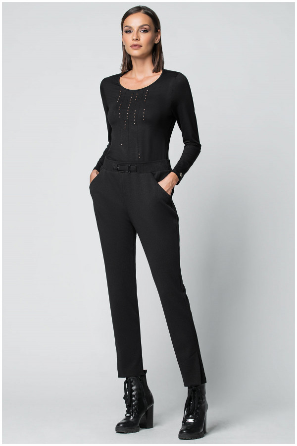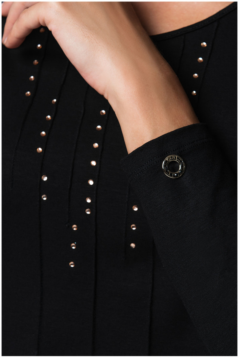 Crna bluza čiji kroj prati liniju tela i ističe struk. Viskoza u kombinaciji sa elastinom čini je vrlo prijatnom na koži i komfornom za nošenje. Prednji deo obogaćen je zlatnim cirkonima. Jednostavno se kombinuje sa mnogim Luna suknjama i pantalonama. Kada želite da postignete poslovni look, dodajte i sako.