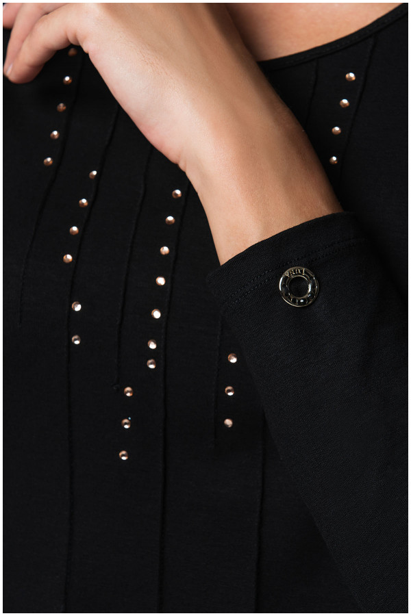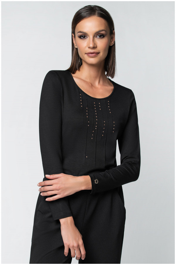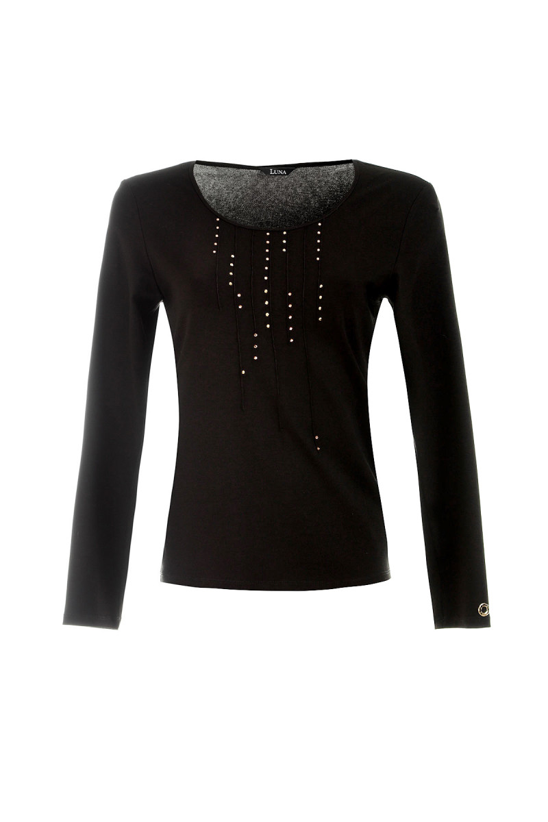 Viskozna crna bluza sa zlatnim cirkonima odlična je za kombinovanje sa mnogim Luna suknjama i pantalonama, a ako dodate sako kreiraćete savršen outfit za poslovni sastanak.