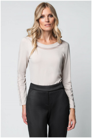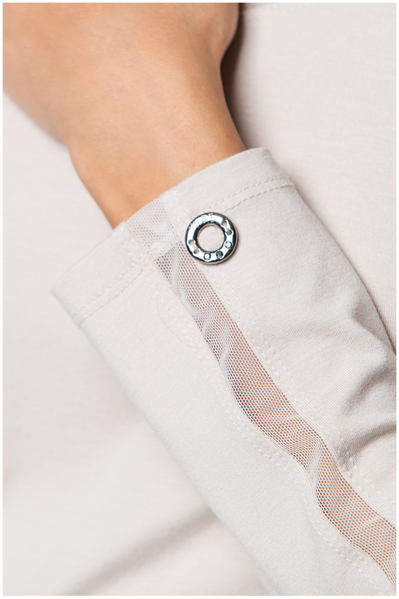 Bež majica sa dugim rukavima, klasičnog kroja sa transparentnim detaljem. Napravljena je od viskozne tkanine sa visokim procentom elastina što je čini vrlo prijatnom za nošenje.