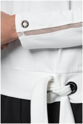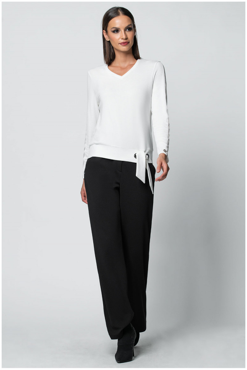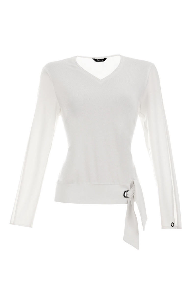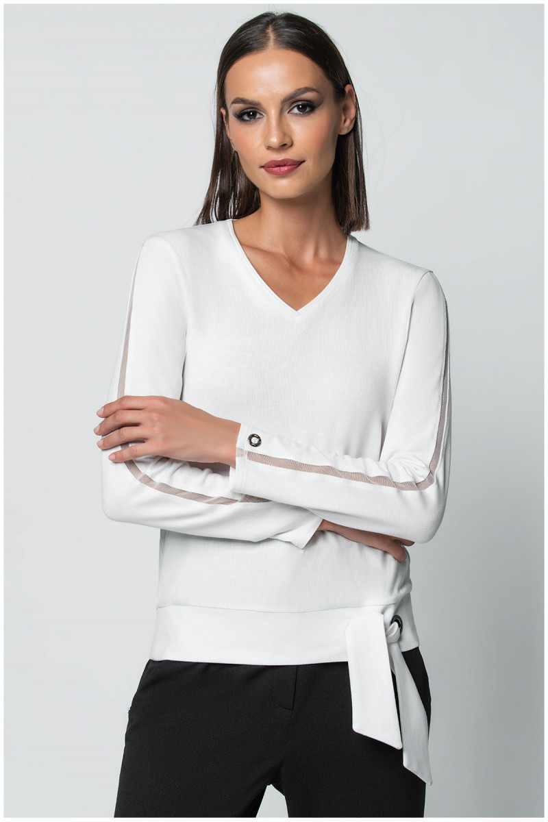 Bela tunika od viskoznog platna sa paspuliranim ‚‚V" izrezom. Rukavi su ukrašeni transparentnom trakom, dok je pojas upotpunjen trakom za vezivanje.