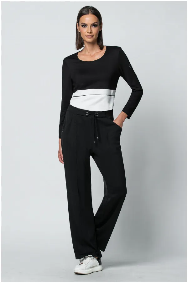 Elegantna crna bluza sa belim obrubom i suptilnim sjajem pruža lagan, prijatan osećaj i...
