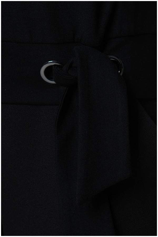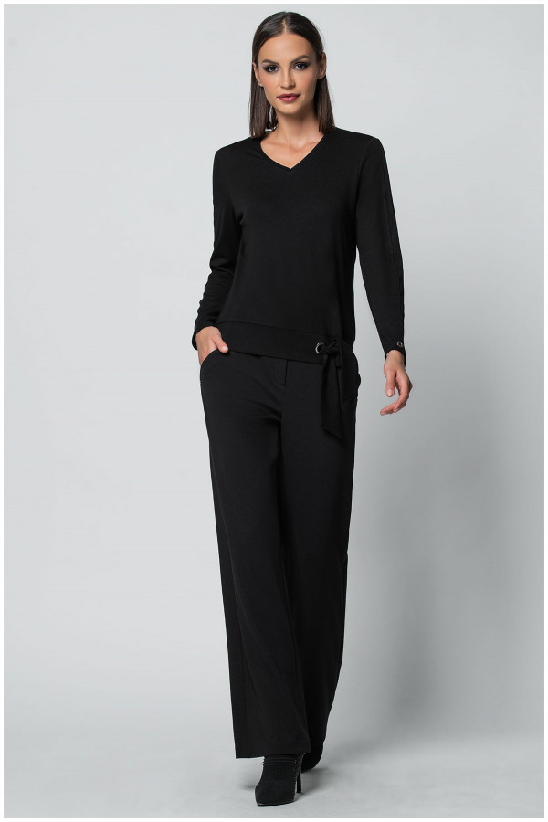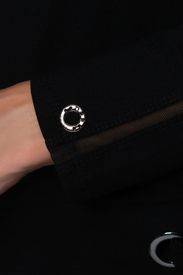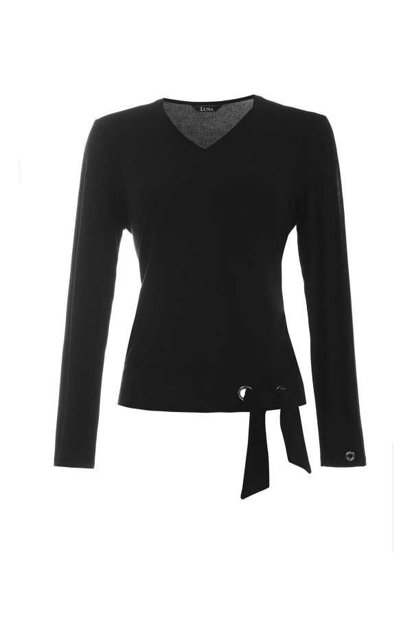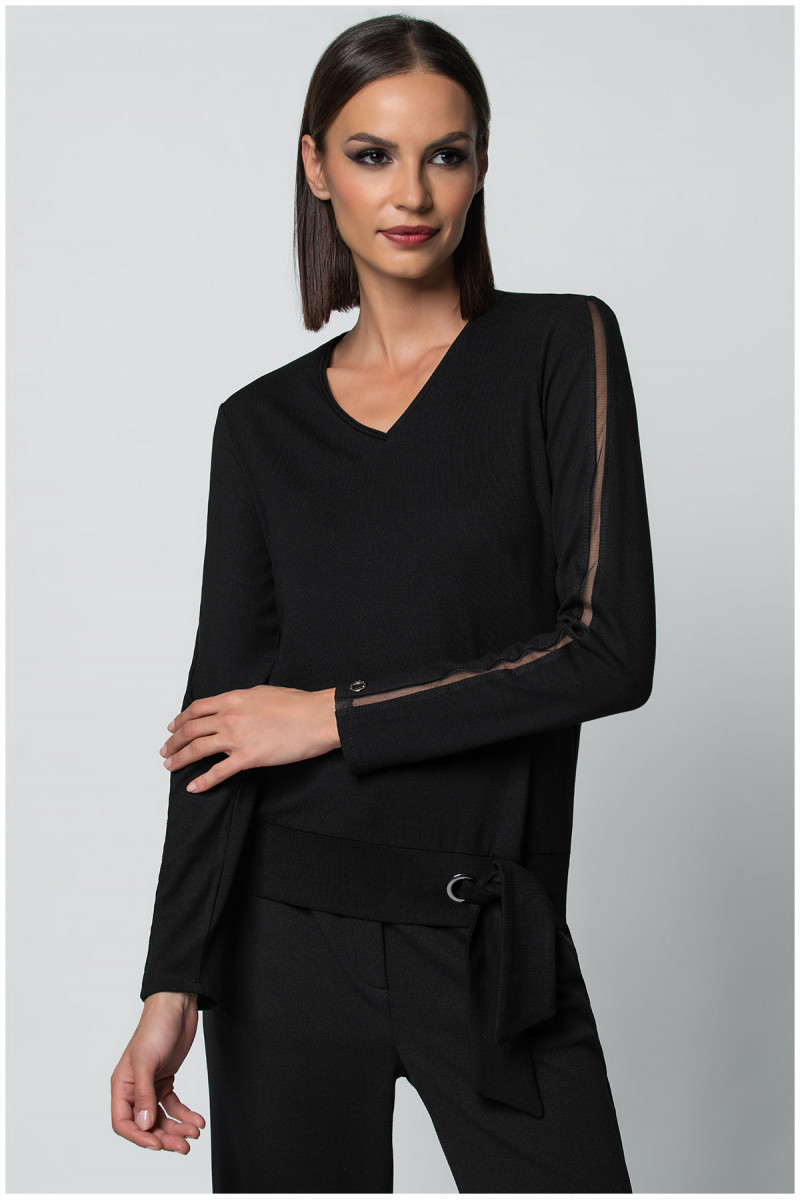 Crna tunika od viskoznog platna sa paspuliranim ‚‚V" izrezom. Rukavi su ukrašeni transparentnom trakom, dok je pojas upotpunjen trakom za vezivanje.