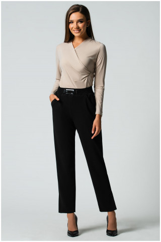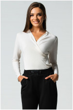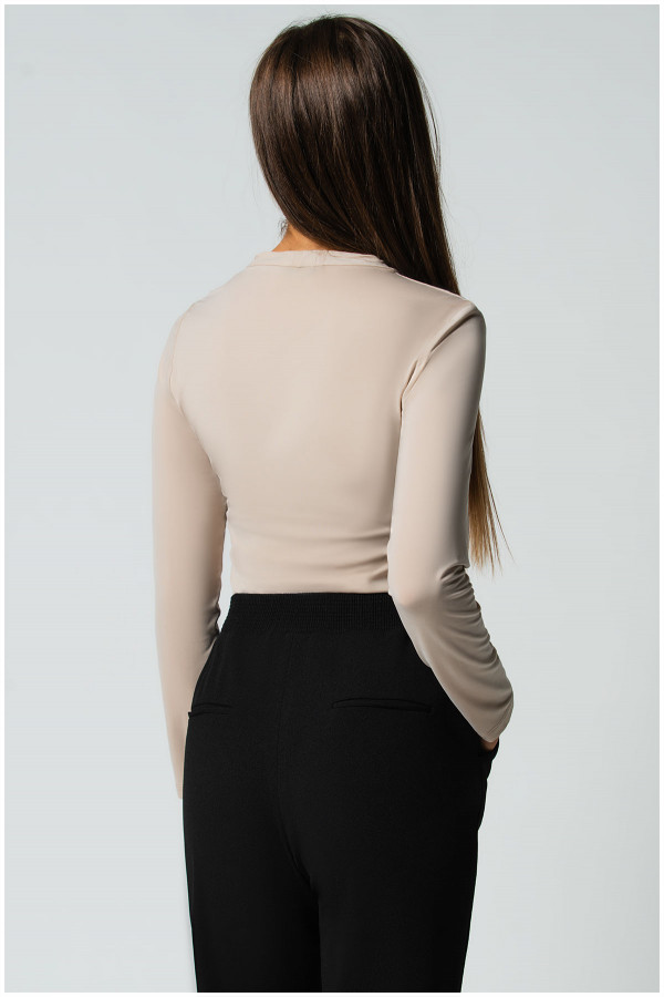 Elegantna bluza u bež boji preklopnog kroja sa suptilnim naborima i mekom, elastičnom t...